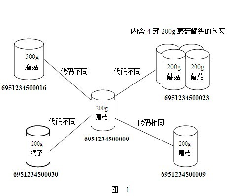 图1表明:不同种类或不同规格或不同包装级别的商品,其商品代码不同;种类、规格和包装级别均相同的商品,其商品代码相同。
