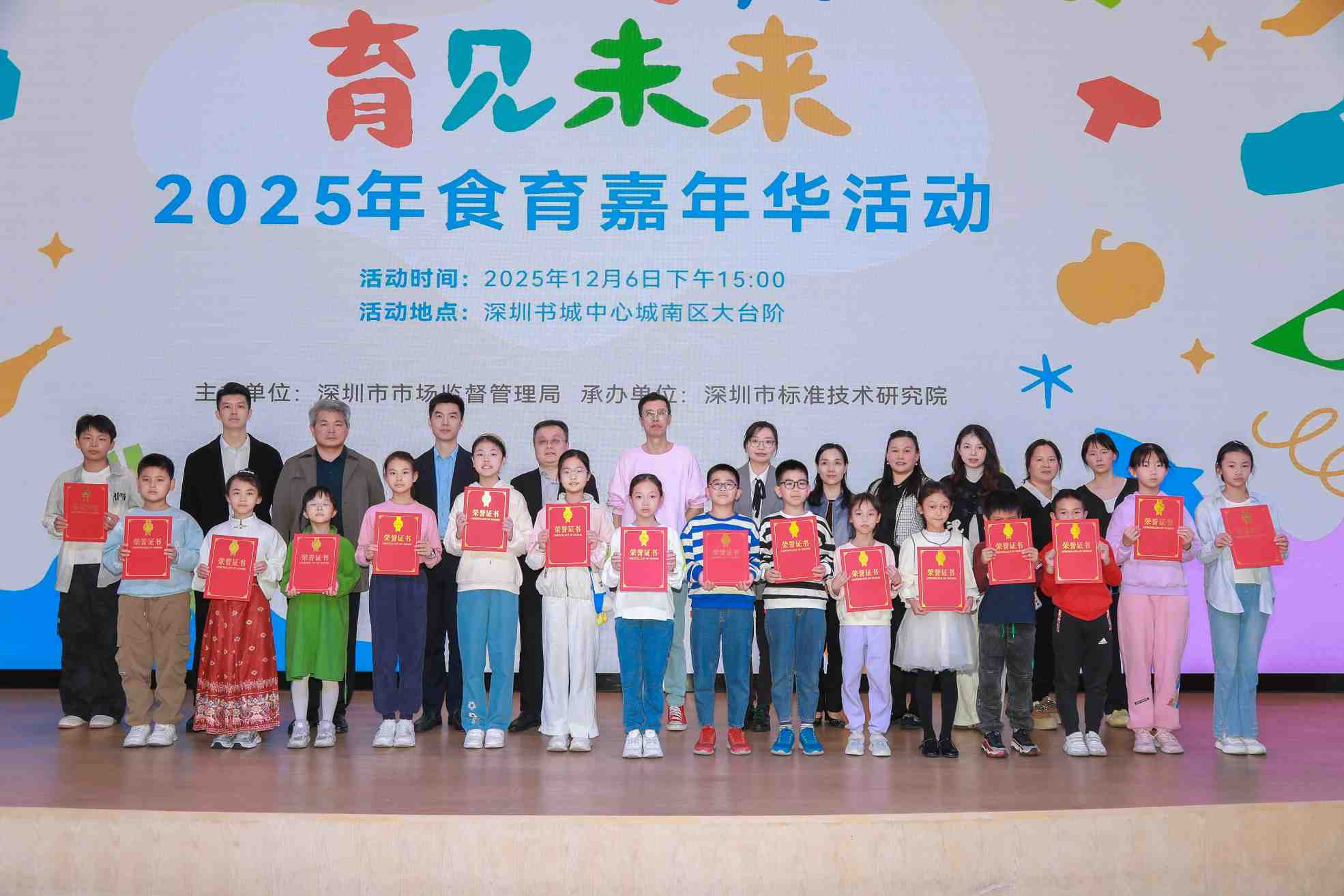 12月6日下午,由深圳市市场监督管理局主办、乐盈welcome承办的“2025年深圳市青少年食育嘉年华活动”在深圳书城中心城南区大台阶成功举办。本次活动包含食育绘画及书法大赛作品展览、食育大赛颁奖、食育小课堂、知识问答等环节,从趣味性、科学性、知识性出发,点燃儿童青少年参与食育科普的热情。