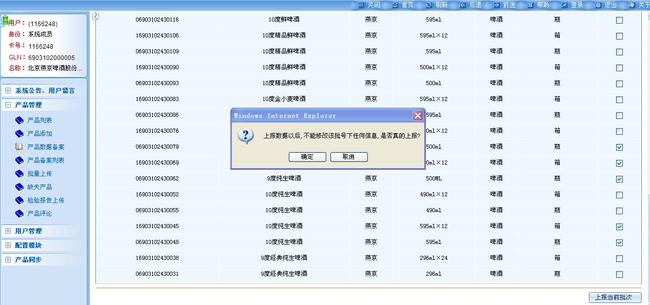 (3) 在“全部子公司列表”中选择需备案产品对应的子公司名称,确认到“当前批次备案子公司列表”中;选择下方需备案的产品,点击“选择”项的复选框;点击页面右下角的“上报当前批次”;见提示信息点击“确定”